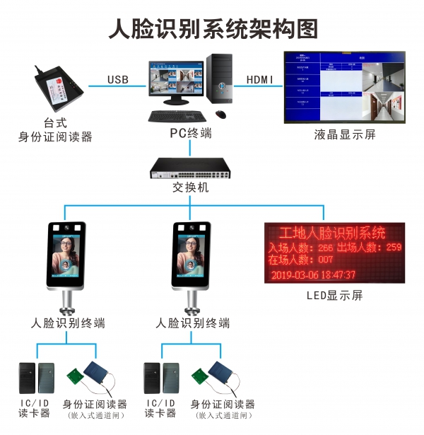 人脸识别考勤与门禁联动,实现封闭式的工地管理,LED屏可以实时显示人员身份信息以及工地内人数情况。