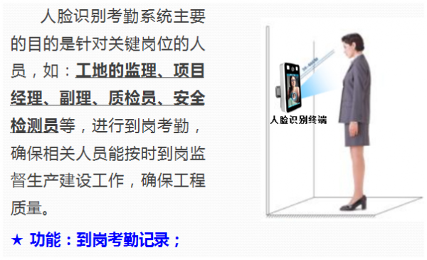 可以快速、便捷、正确的验证监管理事是否按时到岗查询,从而使建筑工地实现安全运营管理,也树立良好的社会形象,产生积极的影响。