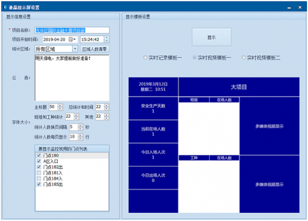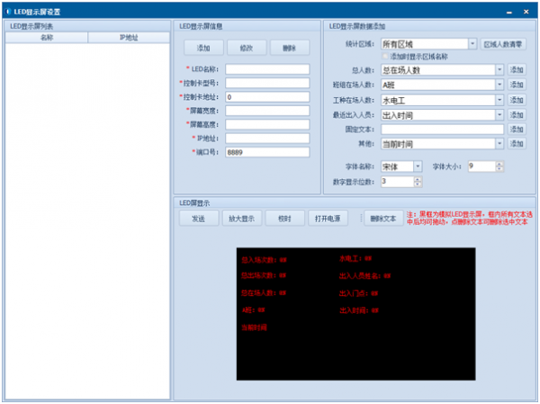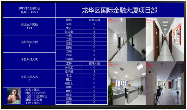 系统具有在场人员统计功能,通常在出入口安装LED显示屏+LCD液晶屏,安装本系统在场人员统计显示软件,实时显示内部工作人员、外来人员工作人员、访问人员在场人数。如园区、工地相当在场人员统计显示。